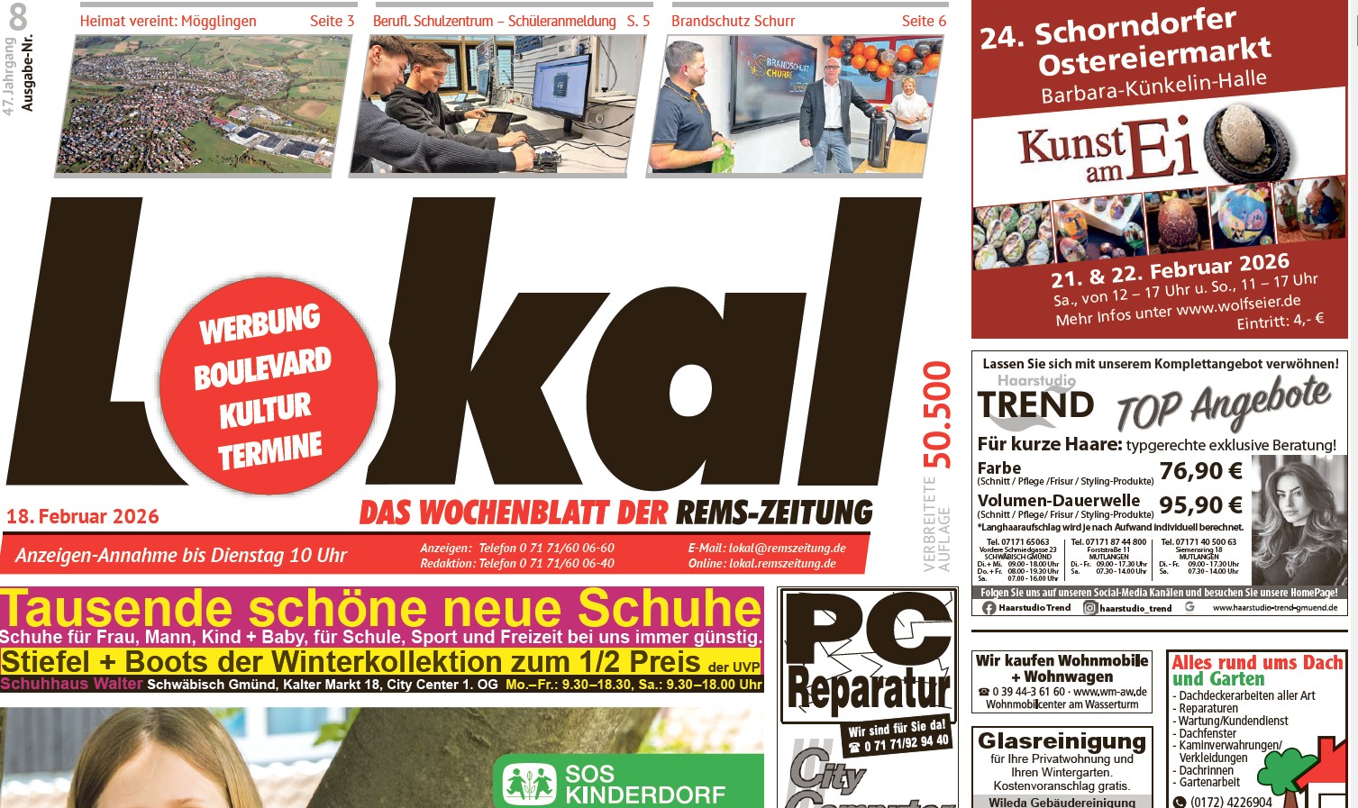 Ein Special widmet sich der Anmeldung für das Berufliche Schulzentrum Schwäbisch Gmünd und stellt die Ausbildungsgänge der beruflichen Schulen in der Stauferstadt vor. Und last but not least stellen wir mit Brandschutz Schurr ein Unternehmen aus Spraitbach vor, das mit dem Umzug in neue Räumlichkeiten für neue Angebote gerüstet ist.