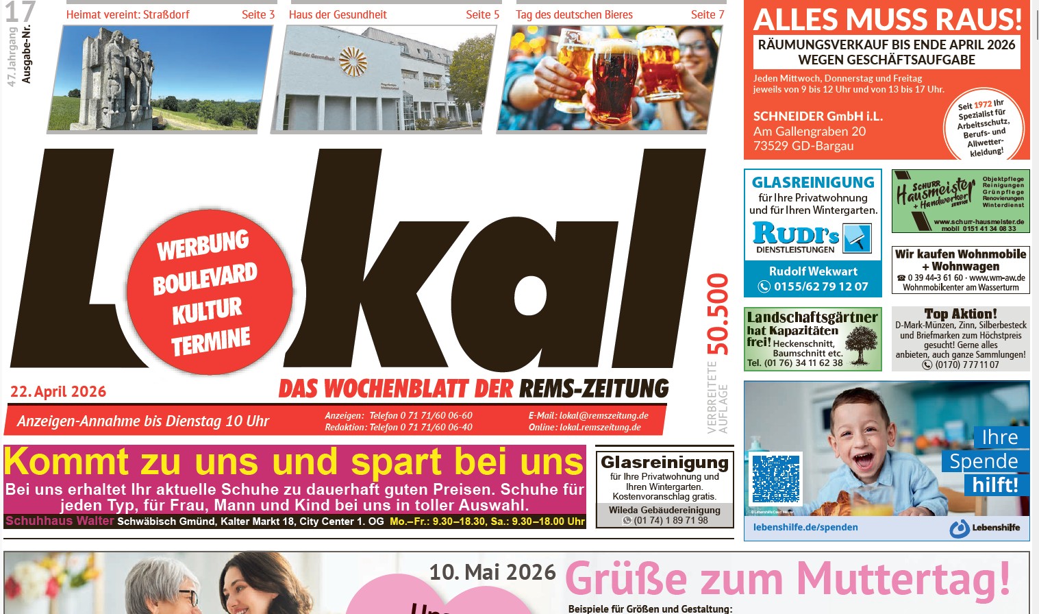 Die aktuelle Ausgabe des Gmünder Wochenblatts informiert unter anderem über das Haus der Gesundheit in Schwäbisch Gmünd und die dortigen Angebote. Ein weiteres Special blickt auf den Tag des Bieres am 23. April voraus und zeigt, warum das bayerische Reinheitsgebot von 1516 so wichtig war. Und unsere Heimatseite widmet sich dem Gmünder Teilort Straßdorf und seiner Vereinslandschaft.