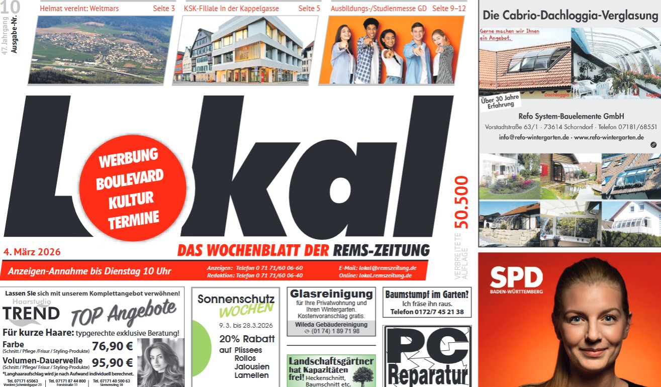 In unserer Heimatreihe stellen wir diesmal den Gesangsverein "Eintracht" aus Lorch-Weitmars vor. Eigentlich könnte man dort in zwei Jahren stolz das 120-jährige Bestehen feiern, doch statt festlicher Musik bestimmen Nachwuchssorgen den Takt. Außerdem geben wir bereits im Vorfeld spannende Einblicke in die Gmünder Ausbildungs- und Studienmesse 2026, welche am Wochenende im Stadtgarten stattfinden wird. Wir erlangen spannende Einsicht über die Sanierungen des Kreissparkassen-Gebäudes in der Kepplergasse und auch einen Ausblick auf den 40. Gmünder Stadtlauf gibt es in dieser Ausgabe.