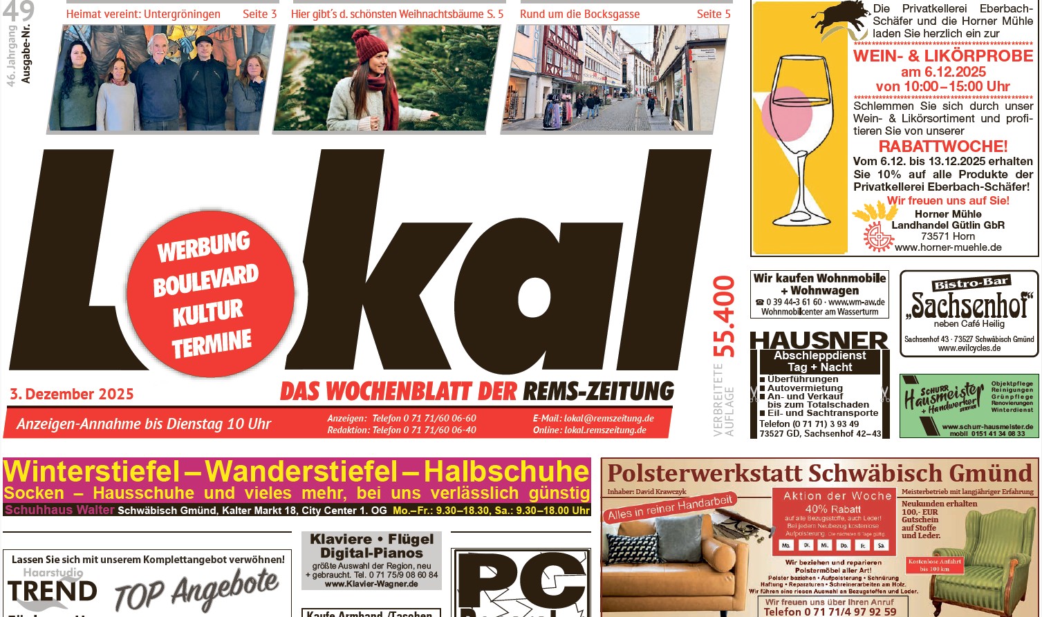 Auf der Heimatseite des aktuellen Gmünder Wochenblatts stellen wir den Verein "Kunst im Schloss Untergröningen" vor, der regelmäßig Kunst von überregionalem Rang im historischen Barockschloss Untergröningen vorstellt. Wer sich noch nicht sicher ist, wo der Christbaum für Weihnachten herkommen soll, findet in unserem Special "Hier gibt es die schönsten Weihnachtsbäume" ein paar Anregungen. Und ein weiteres Special stellt die Bocksgasse, die Gmünder Einkaufsmeile par excellence, vor.