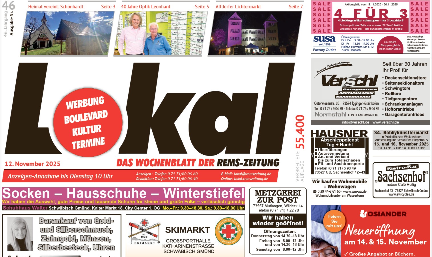Unsere Heimatseite widmet sich diesmal dem Igginger Teilort Schönhardt und seinen Vereinen. Darüber hinaus blicken wir auf den Alfdorfer Lichtermarkt, der am Samstag stattfindet. Auf einer Sonderseite stellen wir überdies den Schwäbisch Gmünder Augenoptik- und Hörakustik-Spezialisten Leonhard vor, der heuer sein 40-jähriges Bestehen feiert.