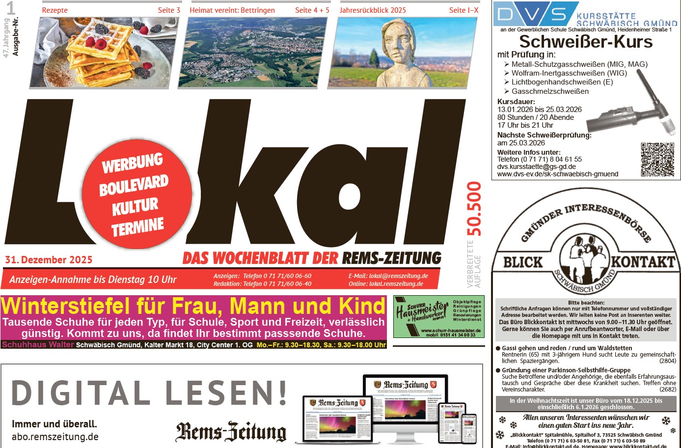 Die aktuelle Ausgabe des Gmünder Wochenblatts LOKAL lässt den Blick zurückschweifen auf ein ereignisreiches Jahr 2025. Im Fokus unserer Reihe "Heimat vereint": der Musikverein Bettringen, der sein 125-jähriges Bestehen mit einer Vielzahl an Festen und Auftritten gebührend gefeiert hat. Doch 2025 brachte auch ein Gmünder Superwahljahr, eine sich zuspitzende Stadtwerke-Krise und etliche Einsätze für Feuerwehr und Rettungskräfte. Einen umfassenden Überblick hält unser Jahresrückblick bereit. Mit Rezepten für Lagerfeuersuppe und panierten Blumenkohl geht's gut gestärkt ins neue Jahr.