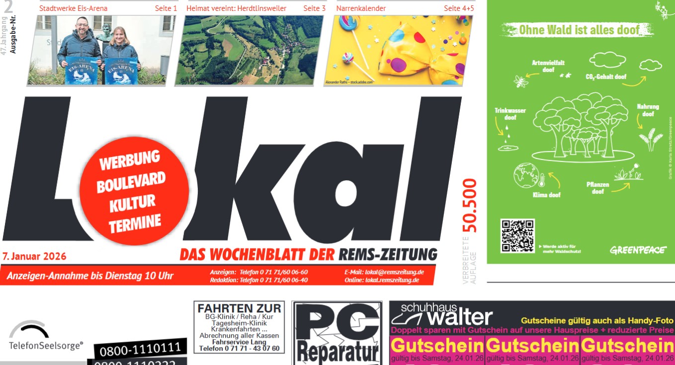 In der aktuellen Ausgabe des Wochenblattes, vom 7. Januar, besuchen wir den Verein zur Dorfentwicklung in Herdtlinsweiler. Die Mitglieder leisten Wunderbares für den Zusammenhalt im Ort und das Staunen vieler Gäste, besonders auch über die Feiertage. Pünktlich zur fünften Jahreszeit haben wir wieder den großen Narrenkalender, damit niemand auch nur einen der lustigen Termine verpassen muss. Außerdem startet am 10. Januar die Stadtwerke Eis-Arena vor dem Gmünde Rathaus. Wir haben alle wichtigen Infos dazu zusammengetragen, sodass einem unbeschwerten Eis-Vergnügen nichts mehr im Wege steht. Natürlich gibt es auch dieses Mal wieder leckere Rezepte, einen Nachrichtenrückblick und vieles mehr.